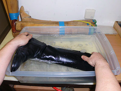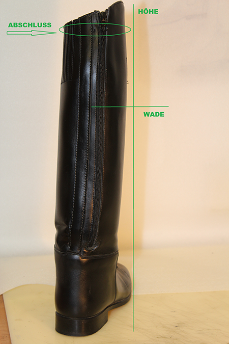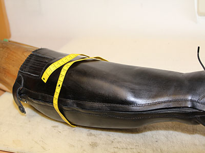 zu 3 cm möglich. Bei dieser Methode wird der Reitstiefel in einem speziellen Lederdehner eingetaucht. Um die weite anzupassen wird der Reitstiefel im nassen Zustand aufgeblockt und ca. 2 bis 3 Stunden in einem Ofen bei 40 Grad getrocknet. Beim trocknen wird die Weite erreicht und der Stiefel gestreckt.